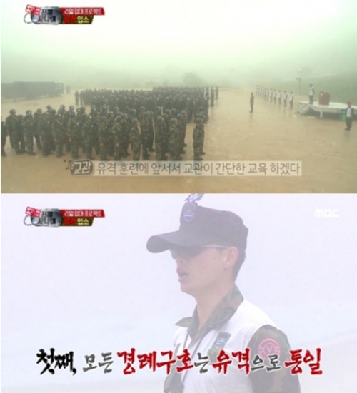 이날 방송에서 멤버들은 대한민국 최대 크기의 화산유격장에 도착해 폭우에도 불구하고 열심히 유격훈련을 받았다. 빨간 모자를 쓴 조교의 지시에 따라 유격 훈련의 첫 단계인 PT체조를 시작했다.