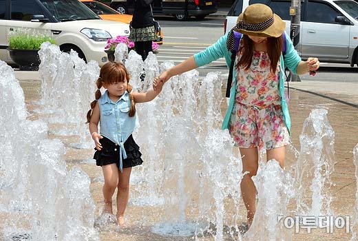 남부지방에 올해 첫 폭염주의보가 내려지는 등 무더위가 기승을 부린 16일 오후 서울광장 분수대에서 어린이들이 물놀이를 즐기고 있다. 방인권 기자 bink7119@