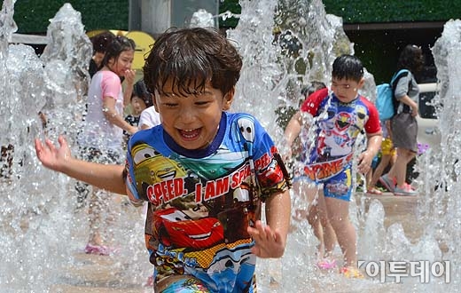 남부지방에 올해 첫 폭염주의보가 내려지는 등 무더위가 기승을 부린 16일 오후 서울광장 분수대에서 어린이들이 물놀이를 즐기고 있다. 방인권 기자 bink7119@