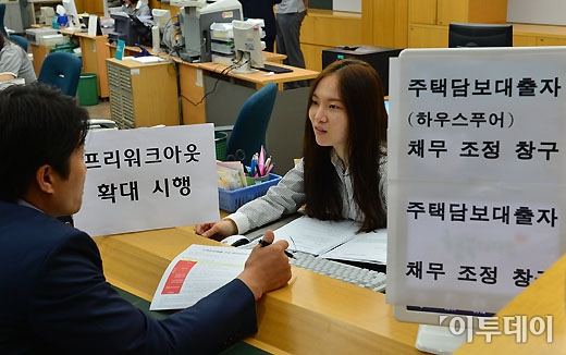 대출금 상환에 어려움을 겪는 주택담보대출 고객들을 위한 사전 채무조정(프리워크아웃) 확대안이 17일 전국 시중 은행에서 본격 시행됐다. 이날 서울의 한 은행을 찾은 채무자가 창구에서 상담을 받고 있다. 양지웅 기자 yangdoo@
