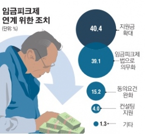 임금피크제 병행 도입을 위해서는 임금피크제 지원금 확대(40.4%), 법으로 의무화(39.1%), 동의요건 완화(15.2%), 컨설팅 지원(4%) 등이 필요하다고 지적했다.