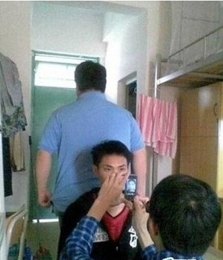 해당 남성의 뒤에는 파란 색 옷을 입고 친구로 추정되는 또 다른 남성이 넓은 등판으로 사진의 배경을 대신하고 있어 보는 이들로 하여금 폭소를 자아낸다.