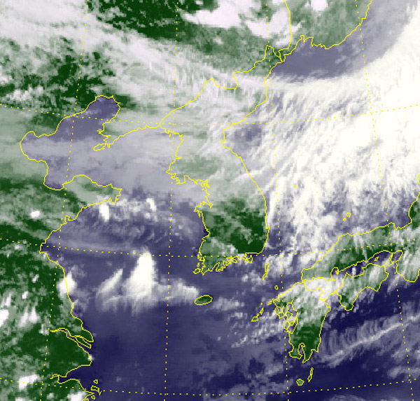 기상청은 17일 장마전선의 영향으로 서쪽지방부터 차차 흐려져 밤에 중부지방에서 비(강수확률 60∼70%)가 시작되겠다고 전했다. 이번 장마는 18일 낮 전국 대부분 지방으로 확대될 것으로 보인다. 사진은 이날 오후 3시 천리안위성이 전송한 한반도 모습