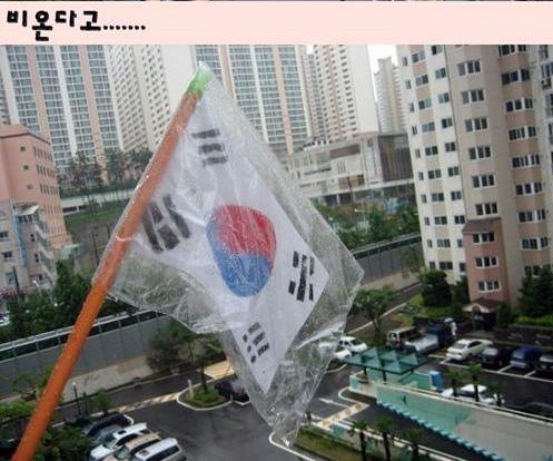 해당 사진에는 창밖에 걸려있는 태극기가 담겨 있다. 사진 속 태극기는 초등학교 1학년 학생이 비에 젖을까 봐 비닐을 씌워 놓은채로 걸려 있었다. '초등학교 1학년의 태극기'다운 발상이다.