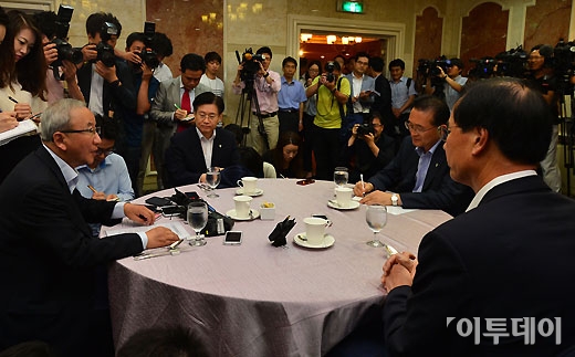 경제민주화 4인방으로 불리는 현오석 경제부총리, 노대래 공정거래위원장, 김덕중 국세청장, 백운찬 관세청장이 18일 서울 여의도 렉싱턴 호텔에서 첫 회동을 가졌다. 이날 조찬회동에서 참석자들이 환담을 나누고 있다. 양지웅 기자 yangdoo@