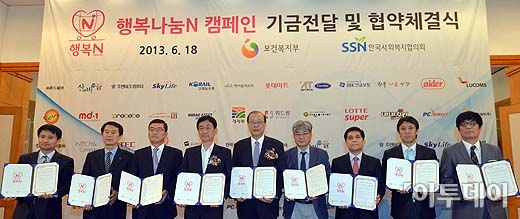 진영보건복지부 장관(왼쪽 네번째)과 차흥봉 한국사회복지협의회 의장(왼쪽 다섯번째)을 비롯한 신규 협약 체결 기업대표들이 18일 오후 서울 마포구 도화동 가든호텔에서 열린 ‘행복나눔N 캠페인 기금전달식 및 협약체결식’에서 기념촬영을 하고 있다. 지난 2010년 4월 시작된 행복나눔 N 캠페인은 나눔을 상징하는 'N마크'가 붙은 제품을 소비자가 구입하면 기업이 수익금의 일정부분을 기금으로 적립해 기부하는 캠페인이다. 방인권 기자 bink7119@