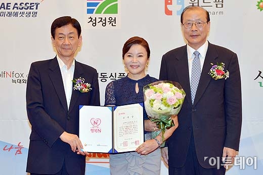 진영 보건복지부 장관(왼쪽)과 차흥봉 한국사회복지협의회 의장(오른쪽)이 18일 오후 서울 마포구 도화동 가든호텔에서 열린 ‘행복나눔 N 캠페인 기금전달식 및 협약체결식’에서 홍보대사로 위촉된 배우 최란 씨와 기념촬영을 하고 있다. 지난 2010년 4월 시작된 행복나눔 N 캠페인은 나눔을 상징하는 'N마크'가 붙은 제품을 소비자가 구입하면 기업이 수익금의 일정부분을 기금으로 적립해 기부하는 캠페인이다. 방인권 기자 bink7119@