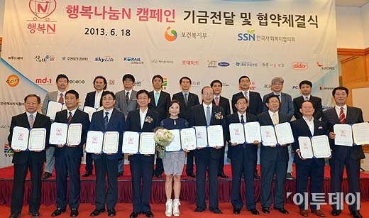 '행복나눔 N 캠페인 기금전달 및 협약식'이 보건복지부와 한국사회복지협의회 주최로 18일 오후 서울 마포구 가든호텔에서 열렸다. 행복나눔 N은 소비자가 나눔을 상징하는 'N 마크'가 붙은 제품을 사면 수익금의 일부가 기금으로 적립되는 기부 캠페인이다. 이날 진영 장관과 차흥봉 협회장, 최란 홍보대사 등이 신규 협약체결 기업대표들과 기념촬영을 하고 있다. 방인권 기자 bink7119@