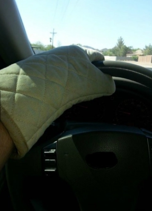 사진에는 자동차 운전석 핸들을 잡고 있는 장갑 낀 손의 모습이 담겨 있다. 그런데 장갑의 모습이 예사롭지 않다. 뜨거운 냄비나 접시 등을 만질 때 손을 보호하는 주방장갑이기 때문이다.