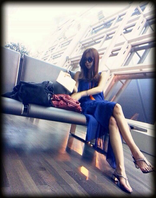 사진 속 홍수아는 파란색 시스루 스타일의 민소매 원피스를 입고 있으며 특히 샌들을 신고 다리를 꼬고 앉아 있는 모습에서 긴 다리가 눈에 띈다.
