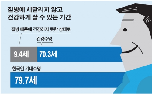 한국인의 기대 수명은 79.7세인데 반해 건강수명은 70.3세 정도인 것으로 조사됐다. 사망에 이르기까지 9.4년 동안 질병 때문에 건강하지 못한 상태로 생을 마감할 가능성이 크다는 셈이다.