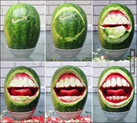 특히 사진 말미엔 붉은 잇몸과 혀를 실감나게 표현해 도저히 수박이라고는 믿기지 않게끔 만든 것.