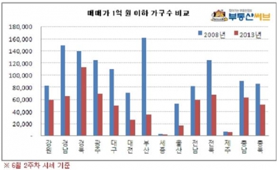 부동산정보업체 부동산써브가 6월 2주차 시세를 기준으로 매매가 1억원 이하 아파트 가구수를 비교한 결과 2008년 128만7048가구에서 2013년 68만6427가구로 60만621가구가 줄어든 것으로 나타났다. 이는 2008년 이후 5년 동안 47%가 줄어든 수치다.