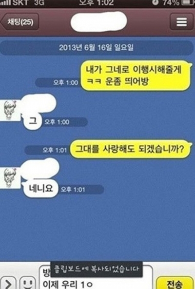 공개된 사진은 두 남녀로 추정되는 인물들이 메신저를 보내고 있다. 메신저를 먼저 보낸 사람은 "내가 '그네'로 이행시 해줄게. 운 좀 띄어봐"라고 하자 상대방이 답으로 "그"라고 운을 띄운다. 그러자 "그대를 사랑해도 되겠습니까?"라고 우회적인 고백을 시작했다.