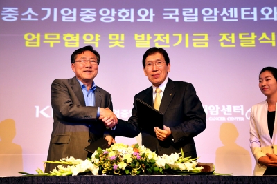 중소기업중앙회는 20일 ‘2013 중소기업 리더스포럼’이 열리고 있는 제주도에서 국립암센터와 저소득층 지원 양해각서를 체결했다고 밝혔다.