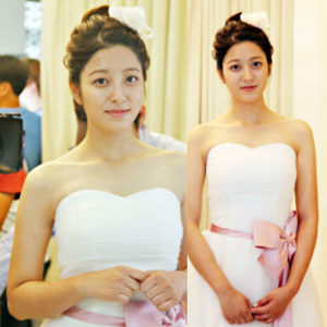 박세영은 특히 웨딩드레스에 핑크색 리본으로 허리라인을 부각시키고 있다. 또 헤어장식으로 포인트를 연출하며 우아한 분위기를 자아냈다.