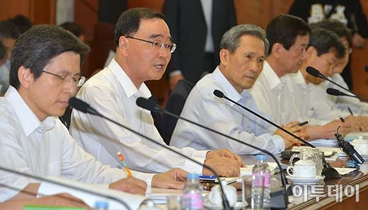 정홍원 국무총리가 21일 오전 서울 세종로 정부서울청사에서 열린 ‘국가정책조정회의’에서 모두발을 하고 있다. 방인권 기자 bink7119@