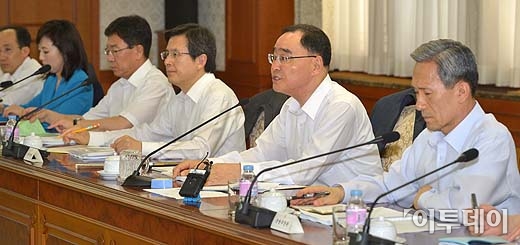 정홍원 국무총리가 21일 오전 서울 세종로 정부서울청사에서 열린 ‘국가정책조정회의’에서 모두발을 하고 있다. 방인권 기자 bink7119@