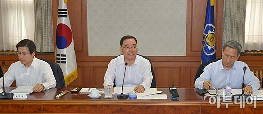정홍원 국무총리가 21일 오전 서울 세종로 정부서울청사에서 열린 ‘국가정책조정회의’에서 모두발을 하고 있다. 방인권 기자 bink7119@