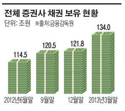 금감원에 따르면 62개 전체 증권사들이 보유한 채권 규모는 지난해 6월 말 114조5000억원, 9월 말 120조5000억원, 12월 말 121조8000억원, 올해 3월 말 134조원으로 늘어났다.