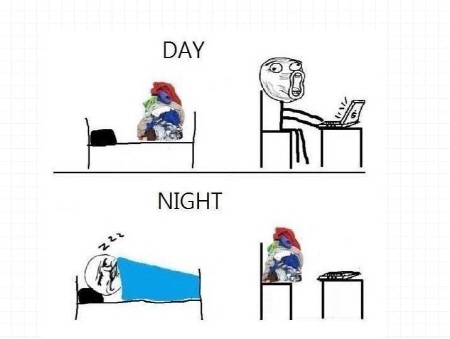 낮을 표현한 그림에는 침대 위에 빨래가 놓여져 있고 그림 속 주인공은 책상에서 노트북을 하고 있다. 반면 밤을 나타내는 그림에는 빨래가 책상 의자 위로 옮겨져 있고 침대에는 그림 속 주인공이 잠을 청하고 있다. 결국 청소하기가 귀찮아 빨래를 정리하지 않고 위치만 바꾼 셈이다.