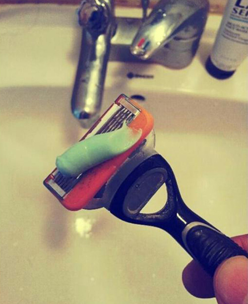공개된 사진 속에는 누군가가 치약을 곱게 바른 면도기를 손에 쥔 모습이 담겨있다. 잠에서 덜 깬 상태에서 면도기를 칫솔로 착각한 분위기여서 안타까움과 함께 웃음을 자아냈다.