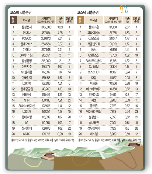 24일 한국거래소에 따르면 유가증권시장과 코스닥시장의 시총 상위사(우선주 제외) 변동 현황을 조사한 결과 지난 20일 기준 코스피 시총 상위 20개사의 비중은 50.08%(538조3701억원)로 지난해 말 대비 0.15%포인트 감소했다.