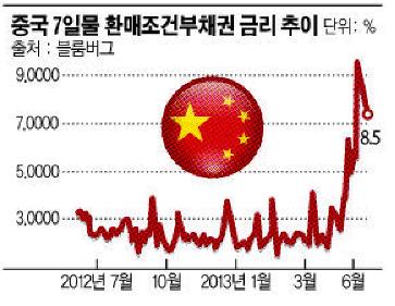 중국 은행간 대출시장 금리 기준인 7일물 환매조건부채권(REPO) 금리는 지난 20일 10.77%를 기록했다. 이는 2주 전에 비하면 세 배 가까이 오른 것이며 2003년 이후 가장 높은 수준이다.