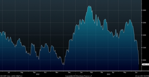 중국증시 상하이종합지수는 24일(현지시간) 전일 대비 5.3% 급락한 1963.24로 마감했다.