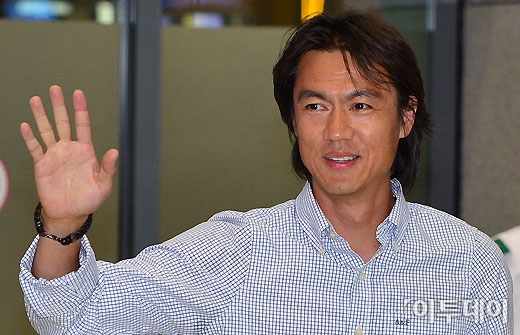 차기 축구 국가대표팀 감독으로 선임된 홍명보 감독이 24일 오후 인천국제공항을 통해 입국했다. 홍 감독이 입국장을 빠져나와 취재진을 향해 인사하고 있다. 양지웅 기자 yangdoo@