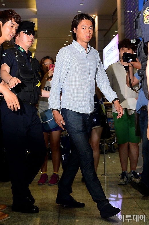 차기 축구 국가대표팀 감독으로 선임된 홍명보 감독이 24일 오후 인천국제공항을 통해 입국했다. 홍 감독이 입국장을 빠져나와 기자회견장으로 향하고 있다. 양지웅 기자 yangdoo@