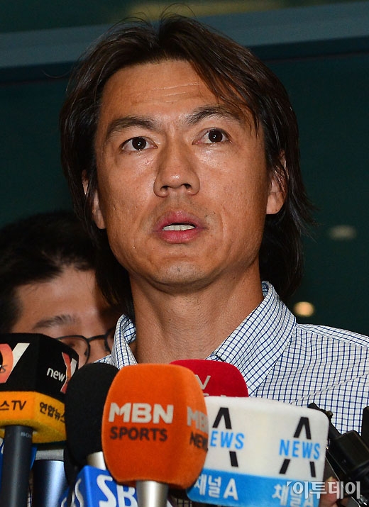 차기 축구 국가대표팀 감독으로 선임된 홍명보 감독이 24일 오후 인천국제공항을 통해 입국했다. 홍 감독이 공항에 마련된 기자회견장에서 취재진의 질문에 답하고 있다. 양지웅 기자 yangdoo@