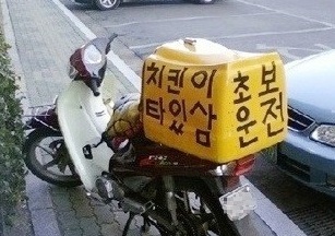 사진속에는 우리가 흔히 보던 치킨배달 오토바이가 있다. 하지만 뒷자리의 치킨이 담겨 있는 통을 보면 '치킨이 타있삼. 초보운전'이라고 씌여있다. 보는 이들의 손발을 오그라들게 하는 무리수를 보여주고 있는 것.