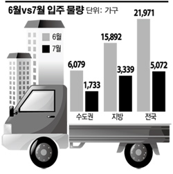 25일 부동산업계에 따르면 올 하반기 아파트 입주물량이 큰 폭으로 감소할 것으로 예상된다. 부동산정보업체 부동산써브에 따르면 7월 전국 아파트 입주물량은 14곳, 총 5072가구다. 이는 6월(2만1971가구)에 비해 1만6899가구 감소한 것으로, 작년 같은기간(1만6101가구)과 비교해도 1만1029가구가 감소했다.