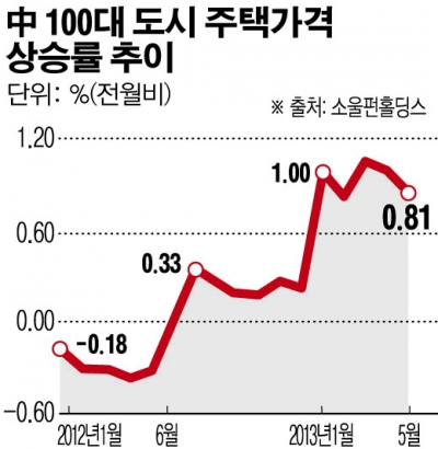 앞서 중국 최대 온라인 부동산정보제공업체 소우펀홀딩스는 5월 100대 도시 주택 평균가격이 전년 동기 대비 6.9% 올랐다고 밝혔다. 전월보다는 0.81% 올라 지난해 6월 이후 12개월 연속 상승세를 나타냈다.