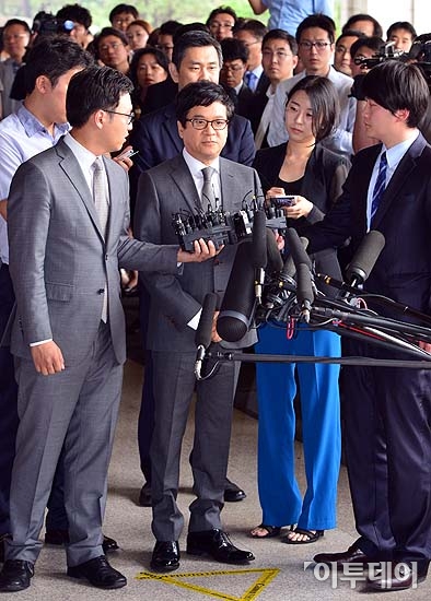 비자금 조성 및 탈세의혹을 받고 있는 이재현 CJ그룹 회장이 25일 오전 서울 서초동 중앙지방검찰청에 출두, 취재진의 질문에 답하고 있다. 이 회장은 CJ그룹의 주식을 차명으로 거래해 양도세 및 소득세 510억원을 내지 않은 혐의를 받고 있다. 방인권 기자 bink7119@