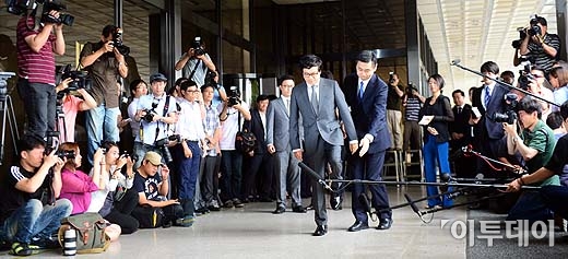 비자금 조성 및 탈세의혹을 받고 있는 이재현 CJ그룹 회장이 25일 오전 서울 서초동 중앙지방검찰청에 출석하다 방송마이크에 다리가 걸리고 있다. 이 회장은 CJ그룹의 주식을 차명으로 거래해 양도세 및 소득세 510억원을 내지 않은 혐의를 받고 있다. 방인권 기자 bink7119@