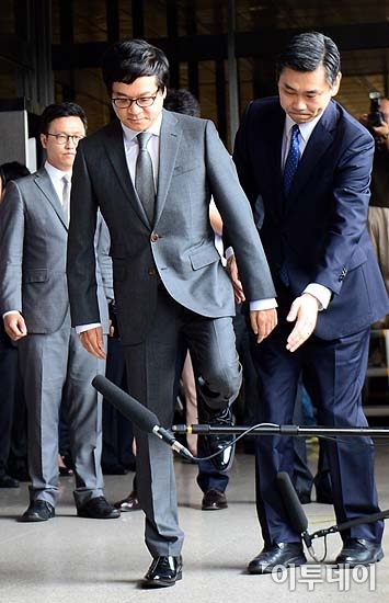비자금 조성 및 탈세의혹을 받고 있는 이재현 CJ그룹 회장이 25일 오전 서울 서초동 중앙지방검찰청에 출석하다 방송마이크에 다리가 걸리고 있다. 이 회장은 CJ그룹의 주식을 차명으로 거래해 양도세 및 소득세 510억원을 내지 않은 혐의를 받고 있다. 방인권 기자 bink7119@