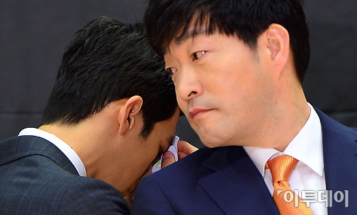 SBS 월화드라마 황금의 제국 제작발표회가 25일 서울 양천구 목동사옥에서 열렸다. 이날 행사에 참석한 탤런트 고수가 땀을 닦고 있다. 양지웅 기자 yangdoo@