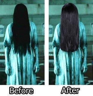 사진에는 샴푸질 전(Before)ㆍ후(After)의 처녀귀신 모습이 담겨있다. 처녀귀신은 샴푸를 하기 전에는 머릿결이 푸석푸석하고 건조하지만 샴푸후에는 마치 전지현 머릿결처럼 윤기가 흐른다.