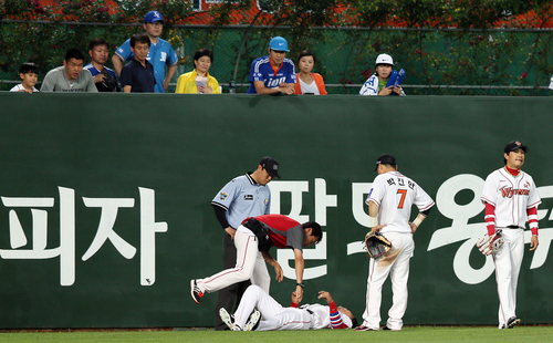 ▲지난 19일 오후 인천 문학구장에서 열린 삼성 라이온스 대 SK 와이번스의 경기. 삼성 조동찬이 좌익수 뒤로 친 2루타를 SK 김상현이 잡으려다 펜스에 추돌, 바닥에 쓰러져 고통스러워 하고 있다.(연합뉴스)