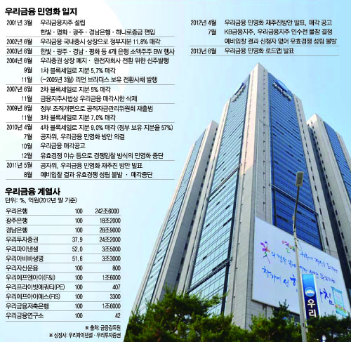 정부가 우리금융지주의 조기 민영화와 공적자금 회수 극대화 및 우리금융 자회사의 경쟁력 제고 등을 위해 우리금융을 세 그룹으로 나눠 매각하기로 했다.