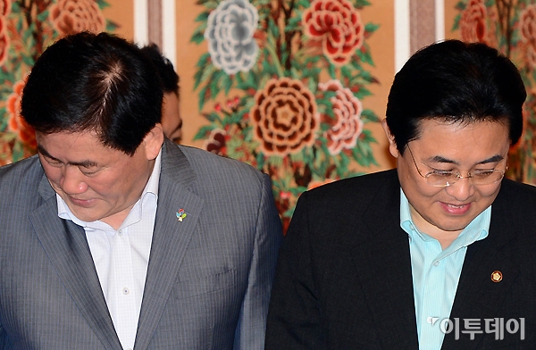 최경환 새누리당 원내대표와 전병헌 민주당 원내대표가 26일 오전 국회 사랑재에서 가진 여야 6인 회의에서 악수 후 자리에 앉고 있다. 노진환 기자 myfixer@