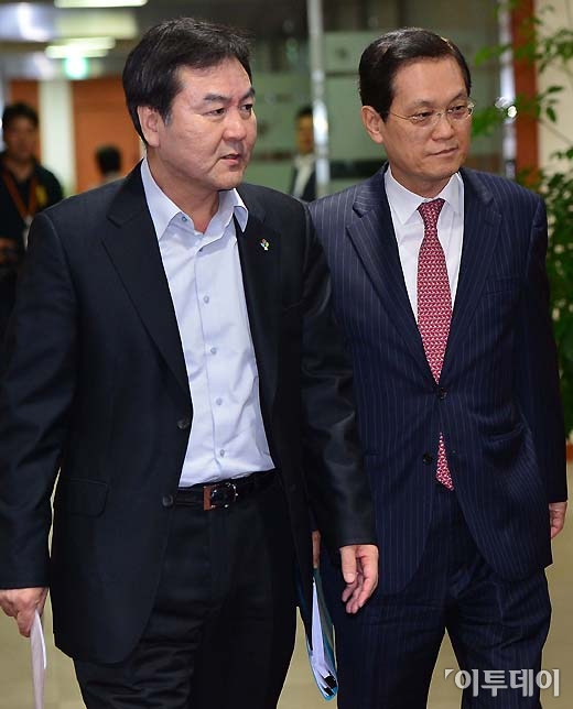 공적자금관리위원회 제78차 회의가 26일 오전 서울 태평로 금융위원회 대회의실에서 열렸다. 신제윤 금융위원장과 남상구 공적자금관리위원장이 대화를 나누며 회의실로 들어서고 있다. 양지웅 기자 yangdoo@