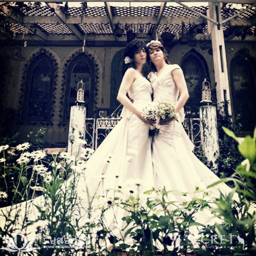 26일 공개된 화보 속에서 두 사람은 웨딩드레스를 차려 입고 파격적인 모습을 연출했다. 김조광수와 김승환은 긴 머리 가발을 쓰고 순백의 웨딩드레스를 입은 채 다정스러운 포즈를 취하고 있다.