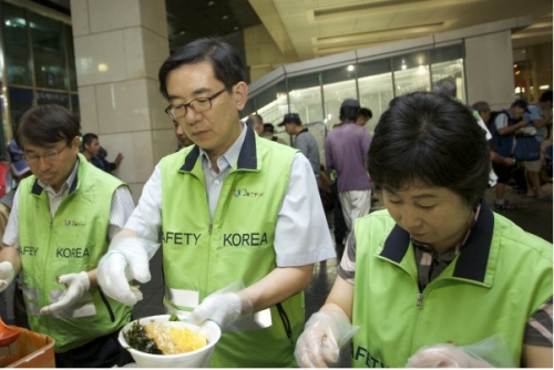 ▲정일영 교통안전공단 이사장(가운데)이 이웃사랑 실천을 위해 지난 25일 영등포역 광장에서 노숙인들에게 사랑의 무료급식을 제공하고 있다.(사진=교통안전공단)