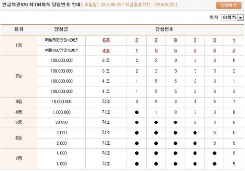 1등 당첨금은 매월 500만 원이지만 세금 22%를 뗀 실수령액은 약 390만원. 2등 당첨번호는 각 1등의 앞 뒤 번호로 6조 229330, 6조 229332와 4조 155231, 4조 155233이다. 2등 당첨금액은 1억원이다.