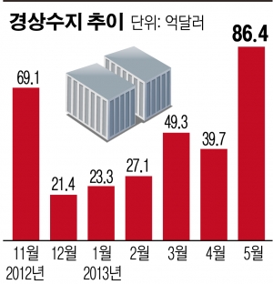 한국은행이 27일 발표한 '5월 국제수지(잠정)'에 따르면 지난달 경상수지 흑자규모는 86억4000만 달러로 전월 39억3000만 달러보다 크게 확대됐다.