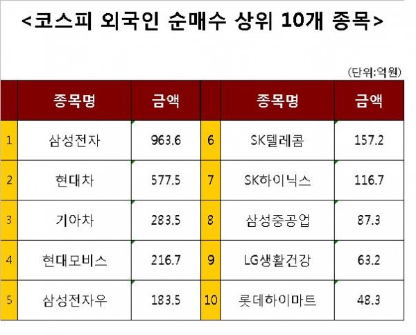 [코스피 외국인 순매수 상위 10개 종목]