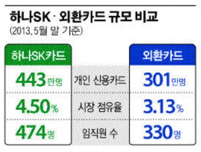 시장점유율 20%대로 업계 1위인 신한카드에는 역부족이지만 10%대인 국민·삼성·현대카드를 위협할 만한 수준이다. 현재 하나SK카드는 국내 8개 전업계 카드사 중 시장점유율이 가장 낮다.